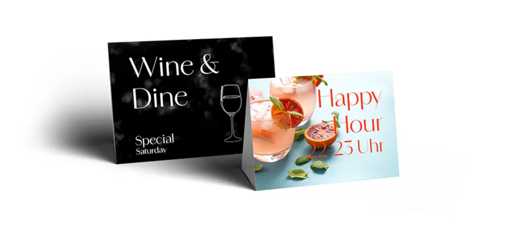 Ob als Menüaufsteller in der Gastronomie, Werbeträger am Point of Sale oder Informationsdisplay auf Messen – unsere individuell bedruckbaren Tischaufsteller sorgen für maximale Aufmerksamkeit - Hochwertig, stabil und flexibel einsetzbar.